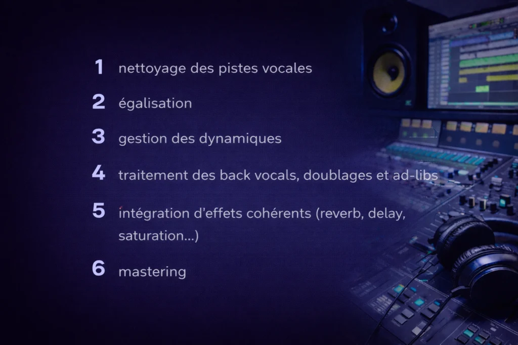 Un mixage voix rap se fait en plusieurs étapes : nettoyage des pistes, égalisation, compression, contrôle des dynamiques et derniers ajustements. Viennent ensuite les effets créatifs, selon la direction artistique.